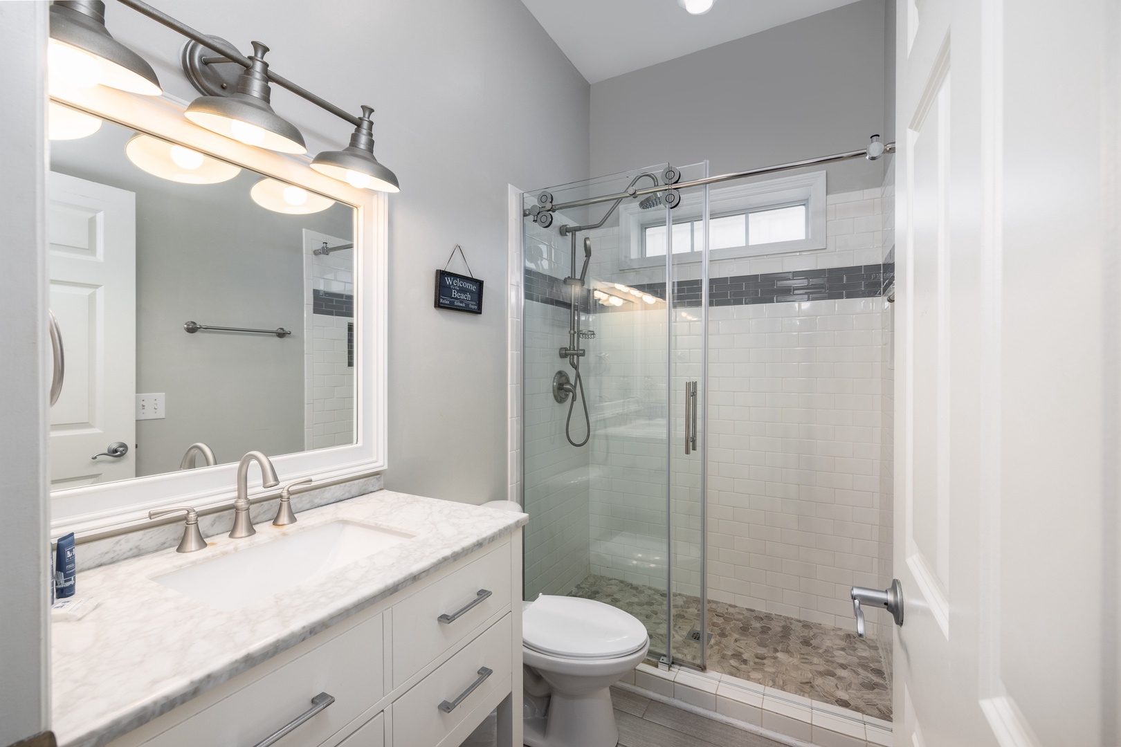 This home includes three full bathrooms, one on the first floor and two on the second floor. All are modern and well-appointed, providing ample space for guests.