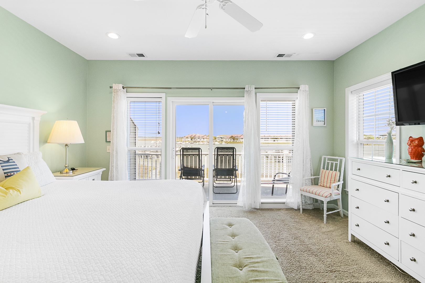Bedroom #2 (Master): King bed, private balcony, en-suite bathroom with jacuzzi tub, walk-in shower, dual sinks, walk-in closet, and a 36” flat-screen TV, located on the upper level.