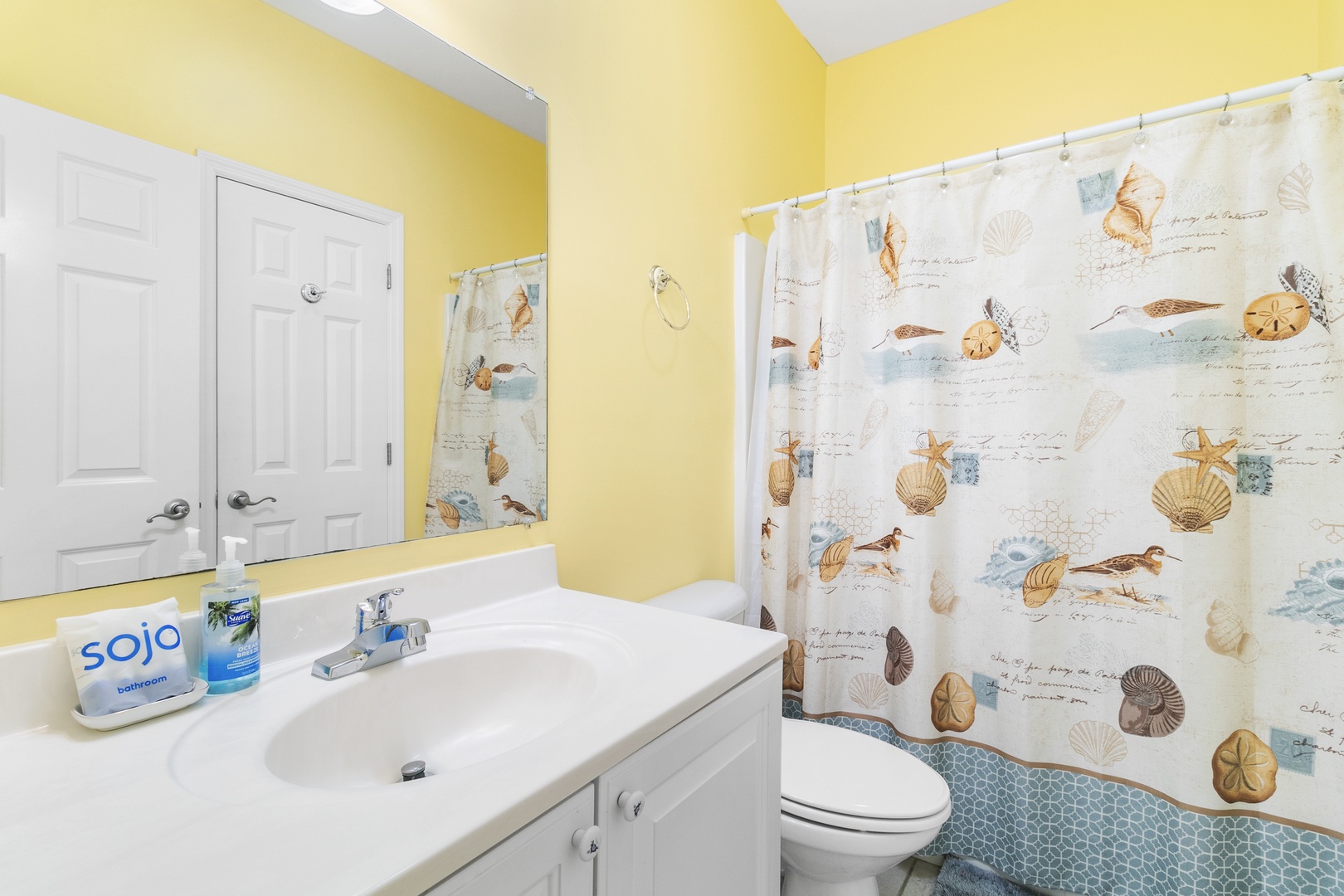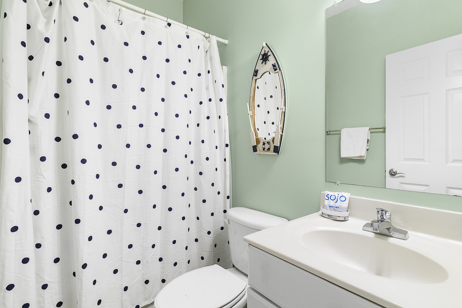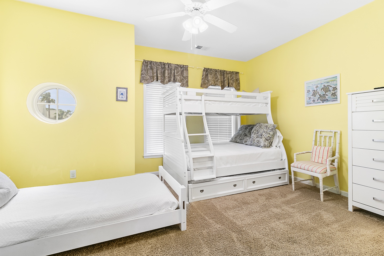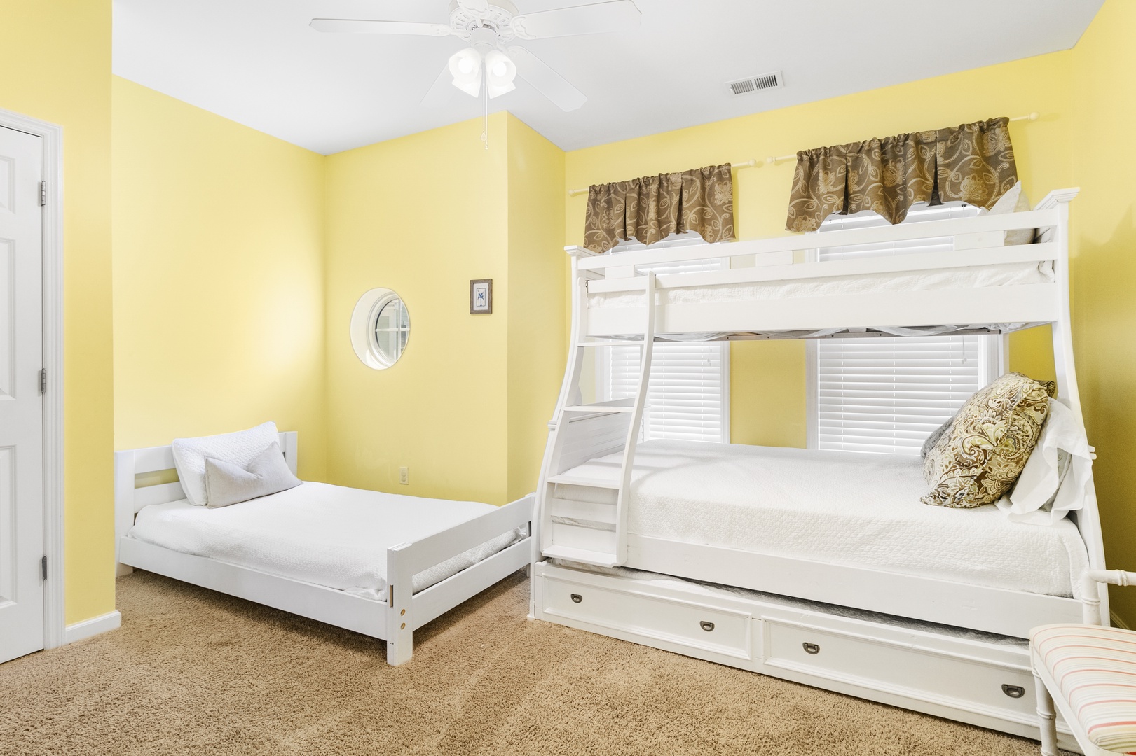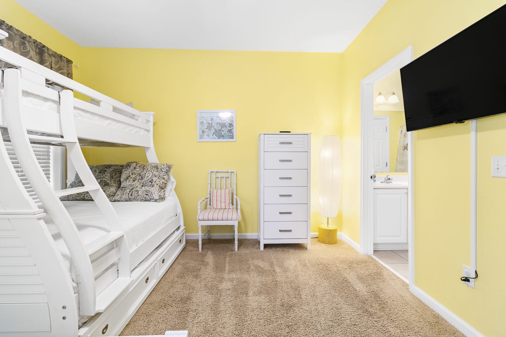 Bedroom #3: Double bed with twin bunk on top, twin trundle, and an additional standalone twin bed, flat-screen TV, private en-suite full bathroom, located on the upper level. Perfect for kids or adults.