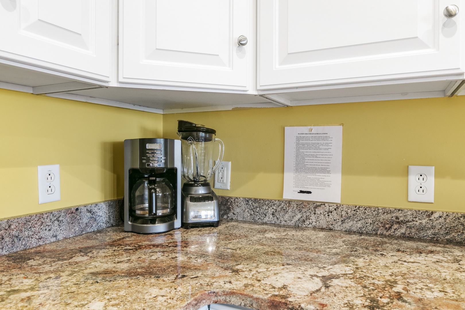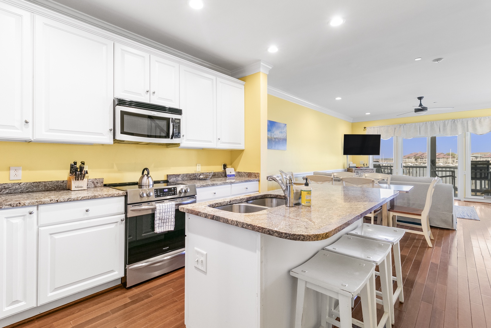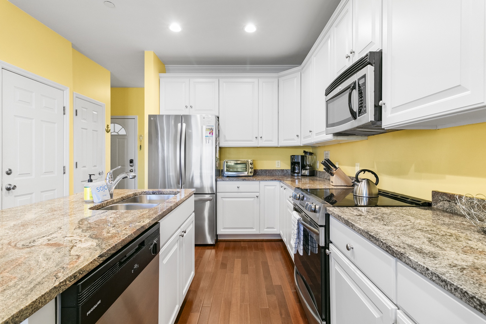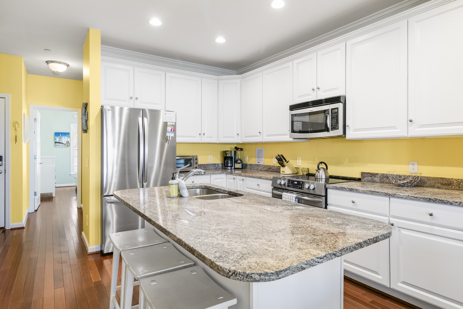 The modern kitchen includes all essential appliances, granite countertops, and ample storage space for preparing meals with ease.