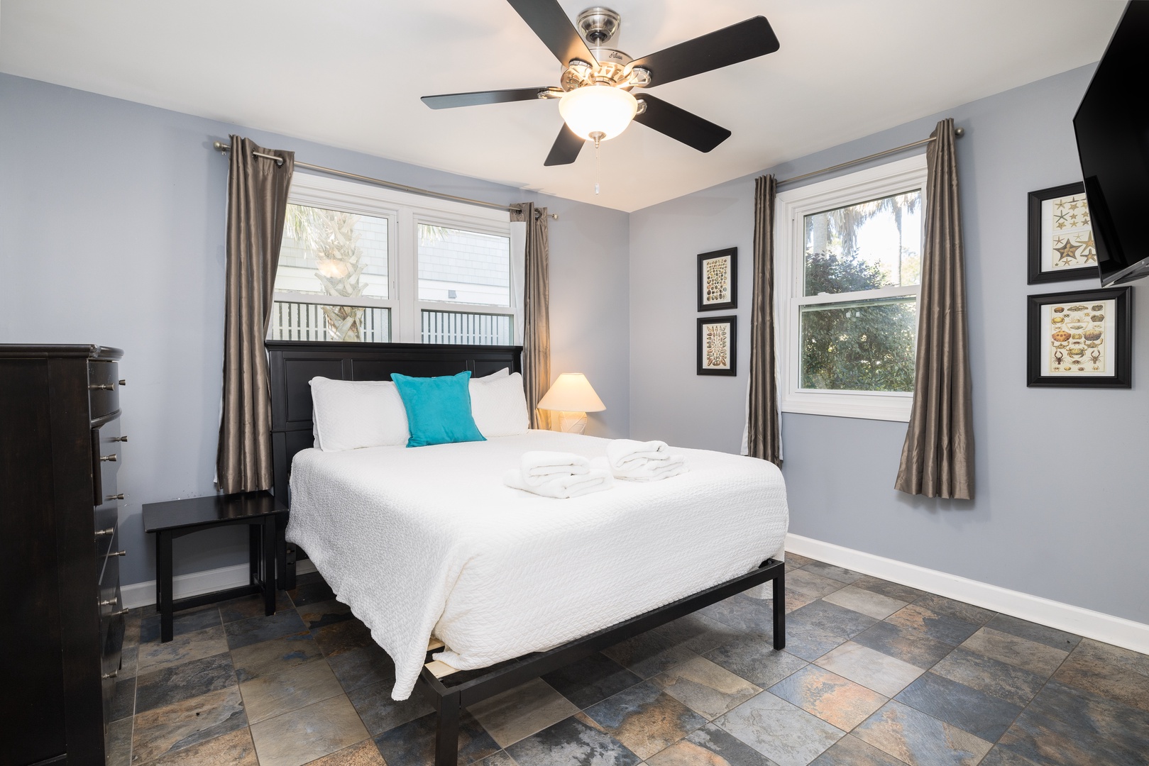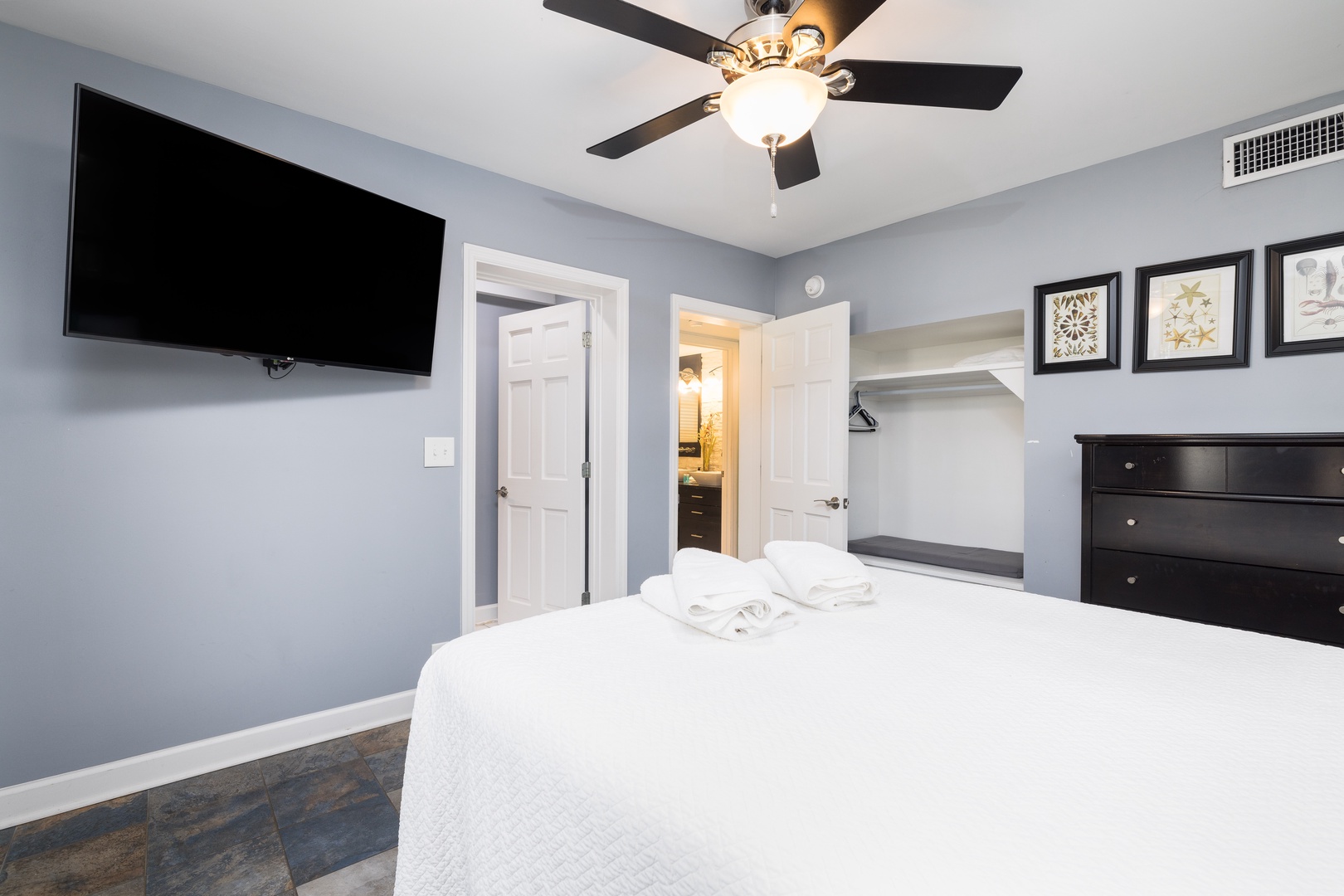 Second bedroom: Cozy twin beds, flatscreen TV, and a cozy reading nook that doubles as a closet and storage.