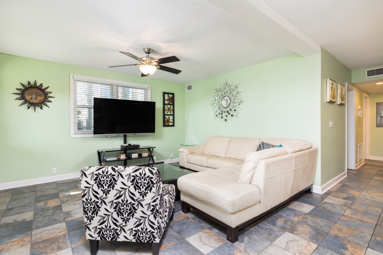 Spacious and comfortable living room. The combination of light and dark furniture brings out a luxurious feel. The sectional sofa and cozy chair face the large flatscreen TV just inside the main entrance. The tiled floor throughout helps keep this apartment cool in the summer heat.