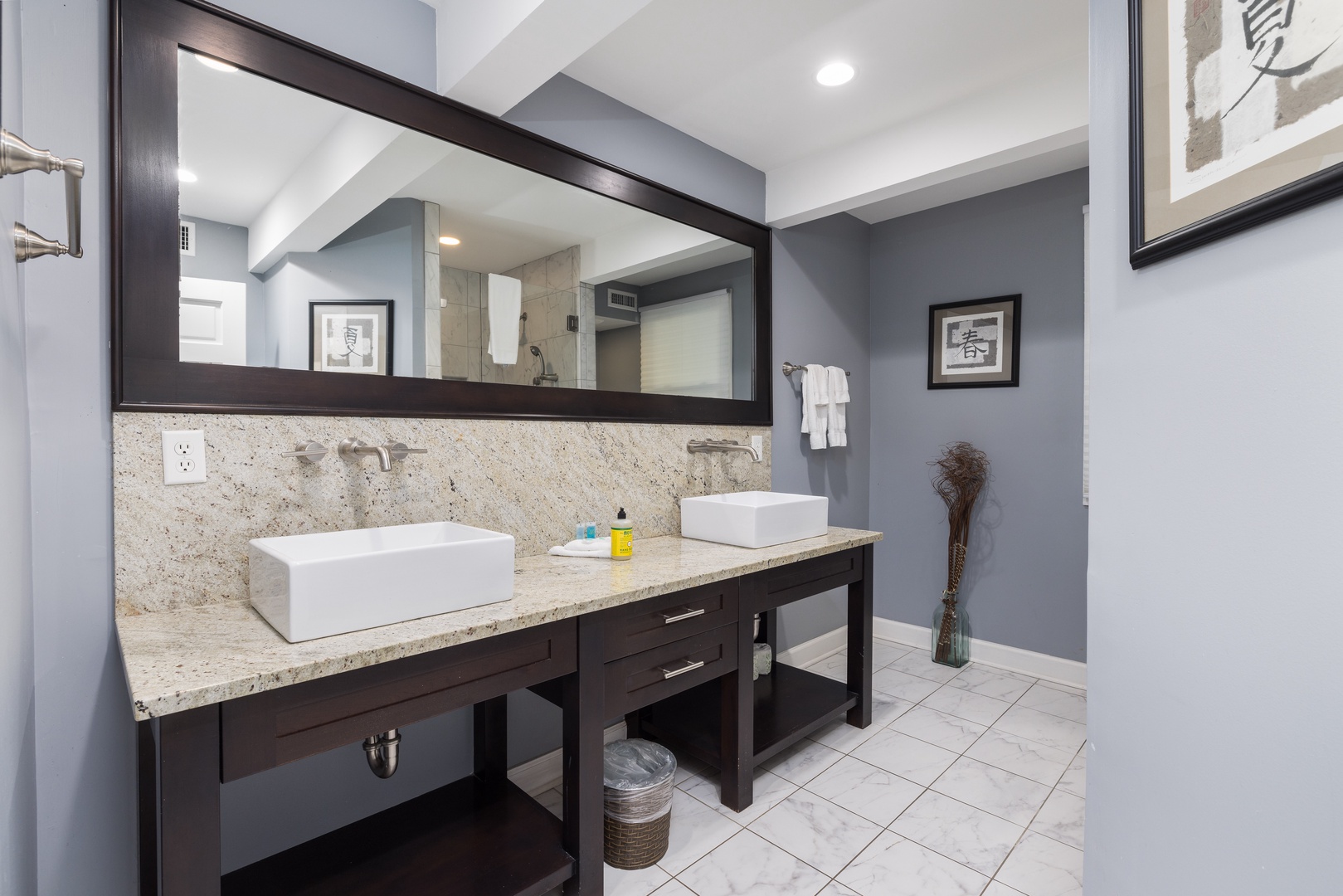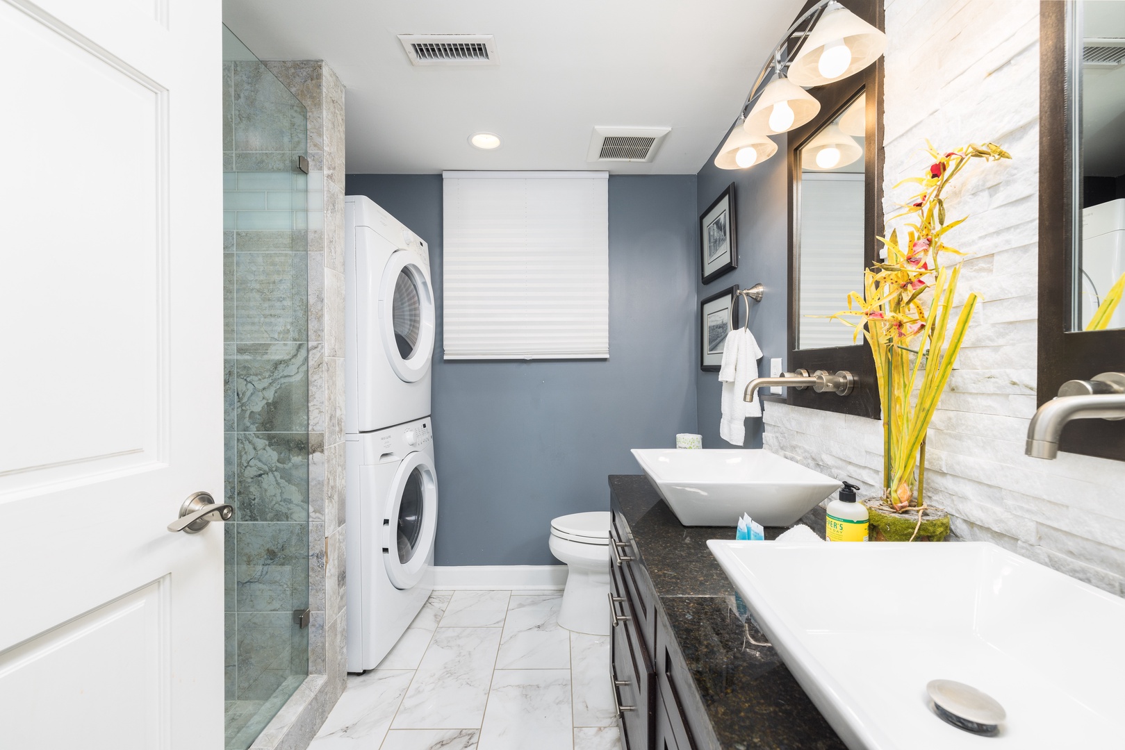 Modern bathroom with a double vanity, glass sinks, and large mirrors. The washer and dryer can also be found here, along with the large tiled shower.