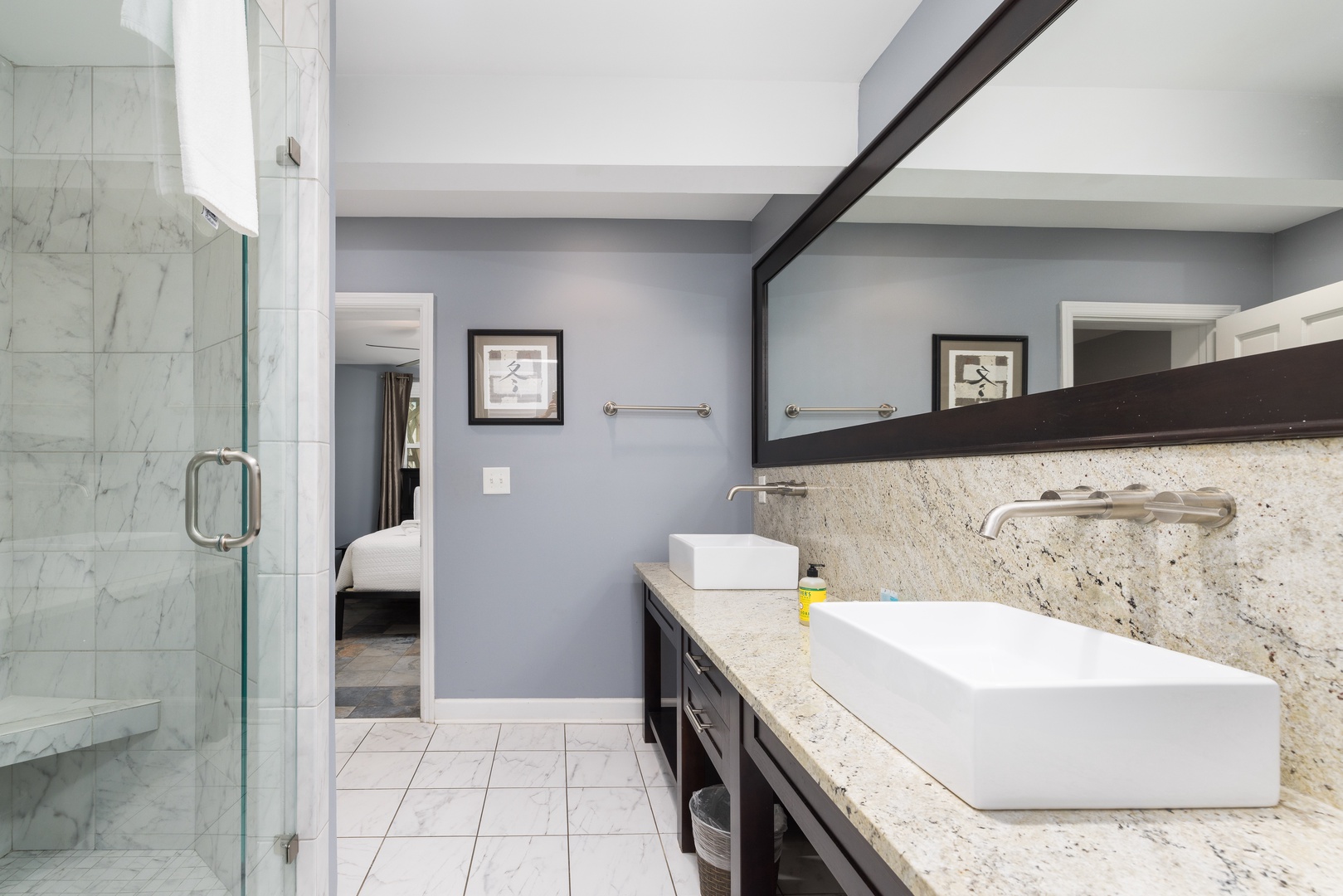 Master bedroom: Comfy king bed. The flatscreen TV is appropriately located for prime relaxation time. The en suite is a stunning room with a double vanity, marble countertops, tiled shower, and a wall-to-wall mirror.