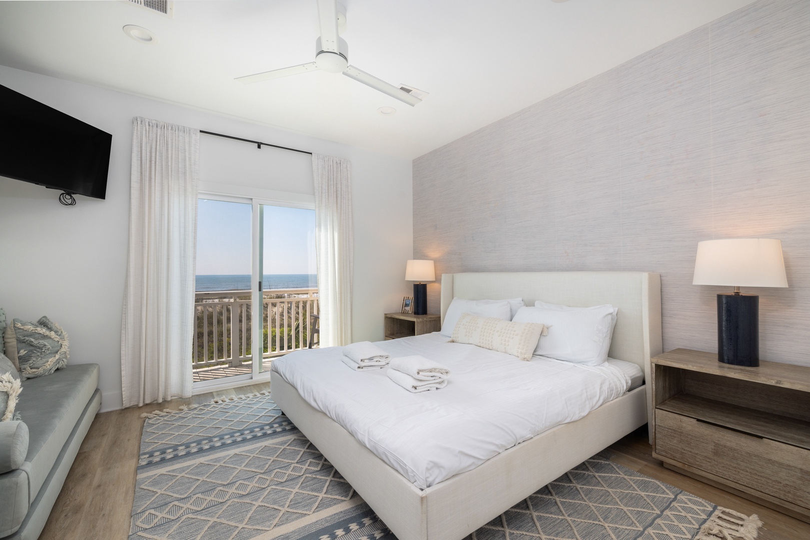 Your primary bedroom includes this large king bed and access to the private deck