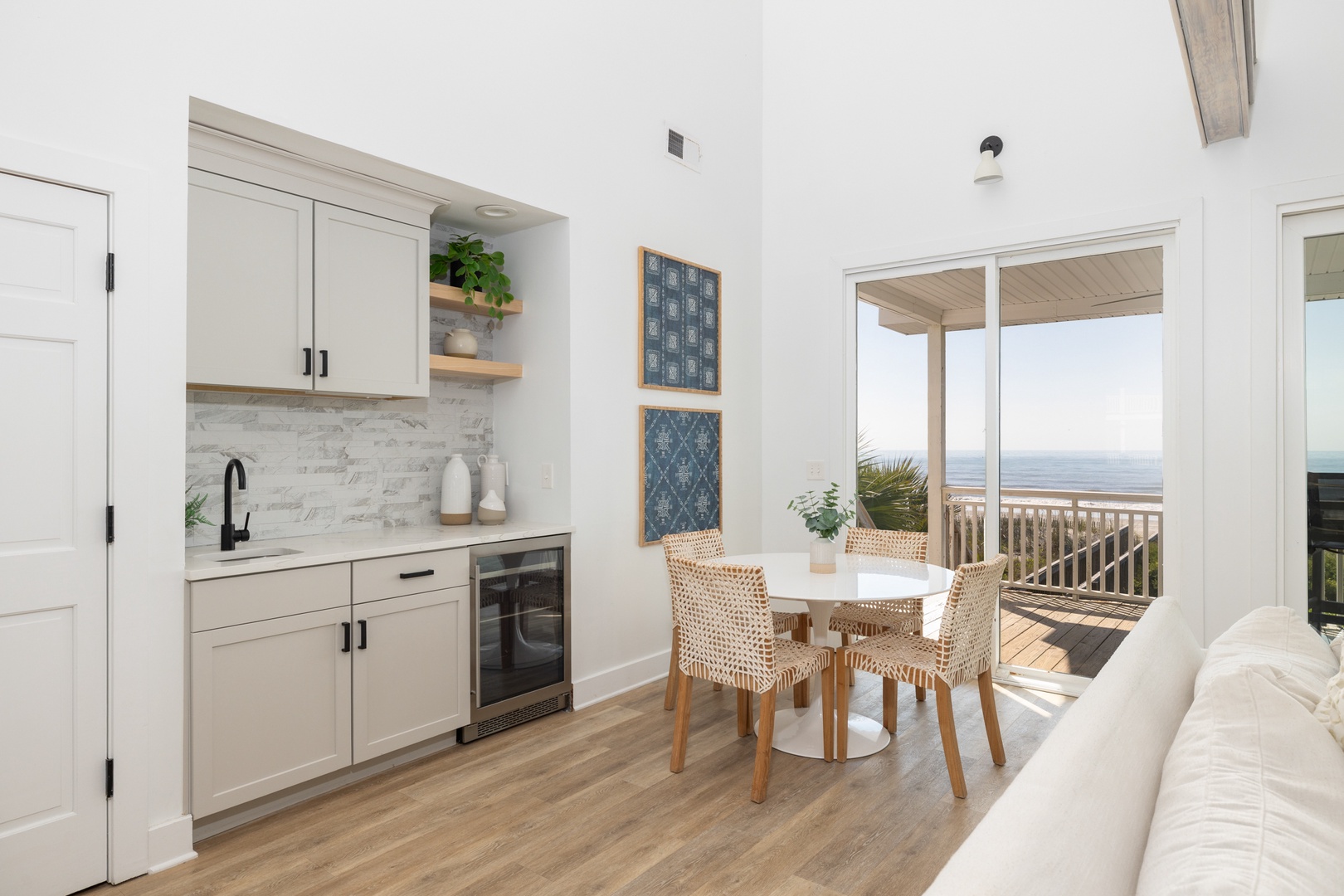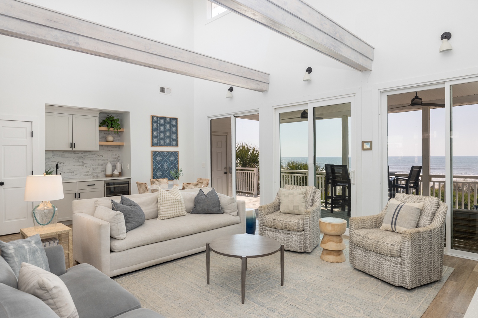 Step into an open-concept living space with large windows that showcase stunning ocean views. The living room is complete with vaulted ceilings, charming wood beams, and a flat-screen TV. The adjacent wet bar with a mini-fridge is perfect for storing your favorite drinks, while a cozy breakfast nook is ideal for coffee, puzzles, or games.