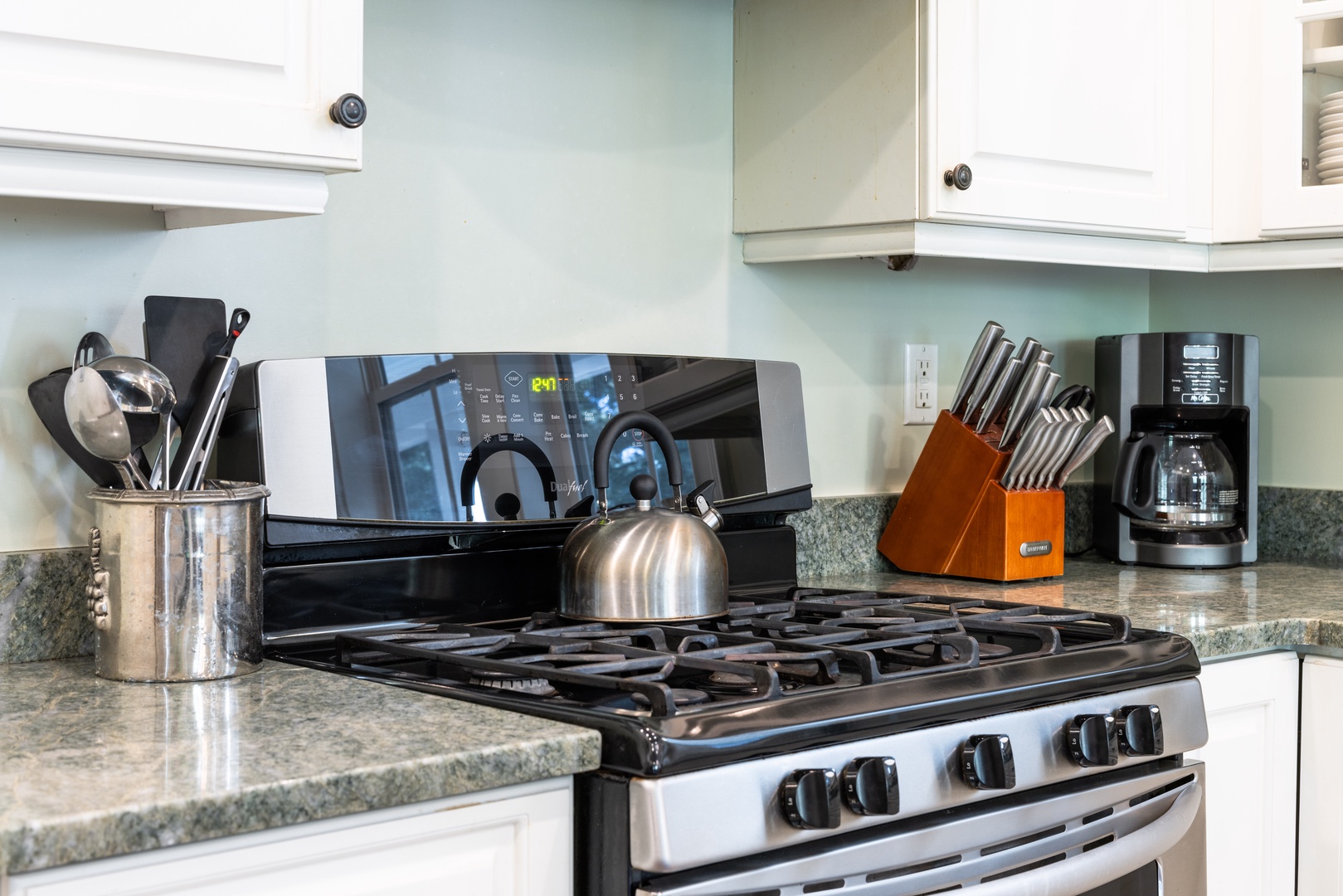 Fully equipped gourmet kitchen with stainless steel appliances and granite countertops.