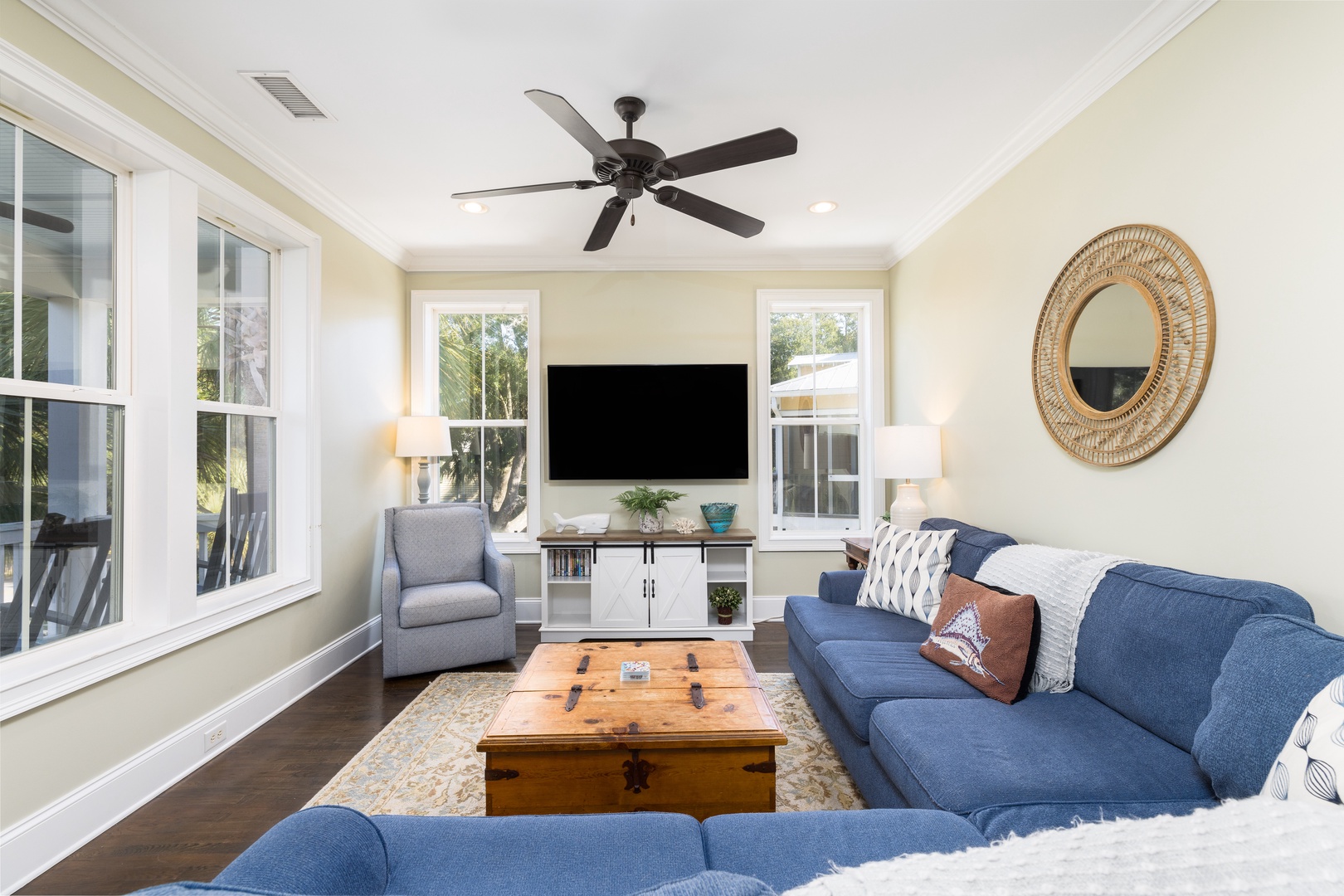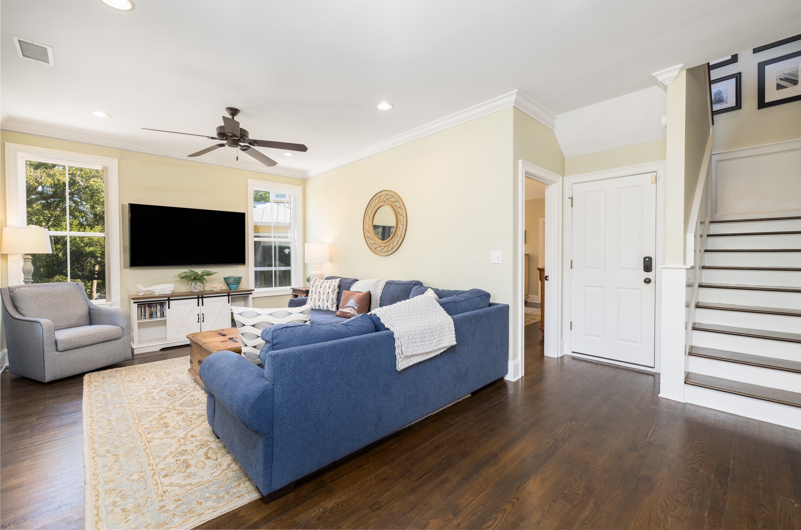 Comfortable seating, perfect for games, conversations, or enjoying movies on the flat-screen TV.