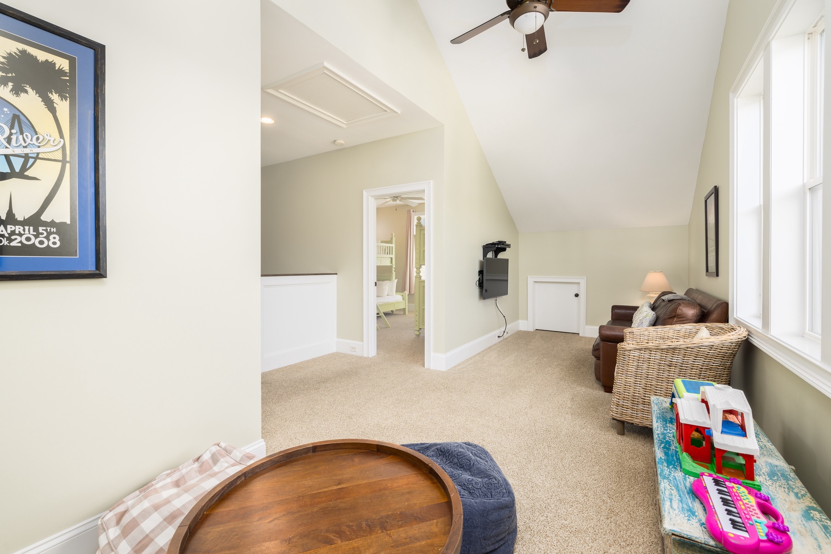 Cozy loft space with a wall-mounted flat-screen TV, sofa, and a kid’s play closet, perfect for children and teens.