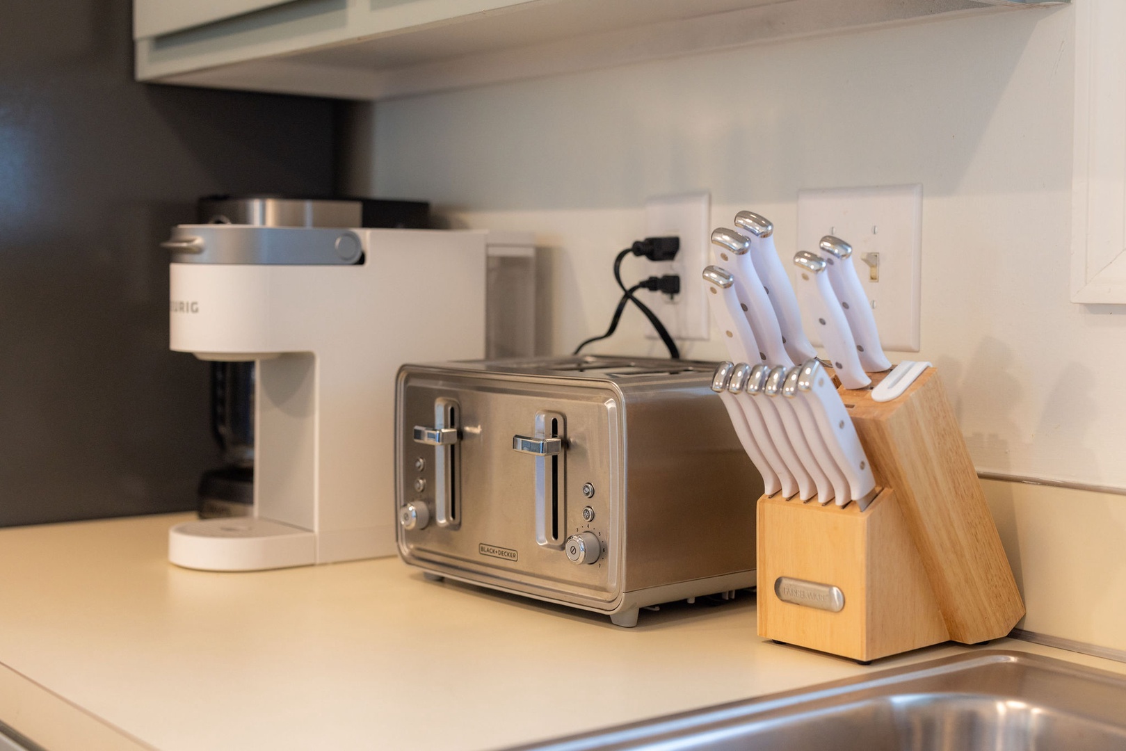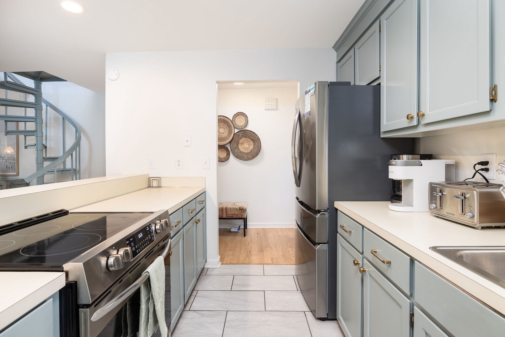 Fully equipped kitchen with new, top-of-the-line appliances and all essentials for meal preparation.