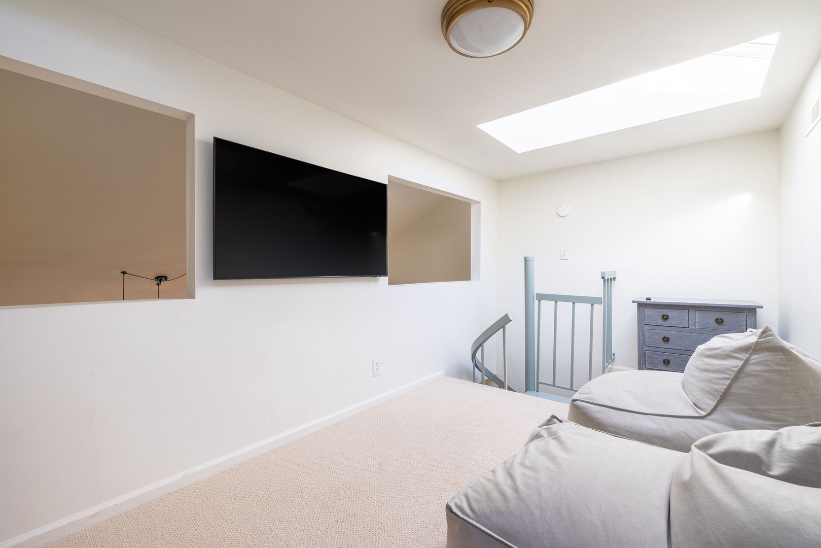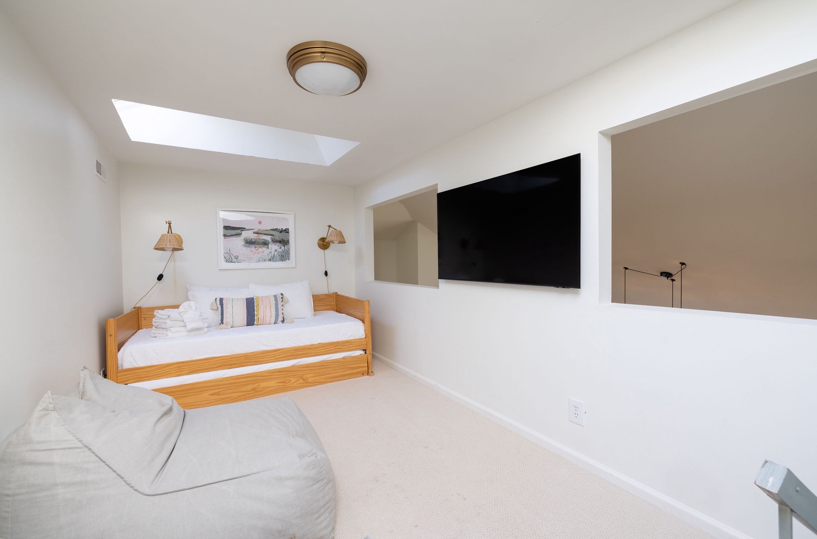 Cozy loft accessible via a spiral staircase, featuring a twin trundle bed, comfortable chairs, and a flat-screen TV, ideal for movies or quiet reading.