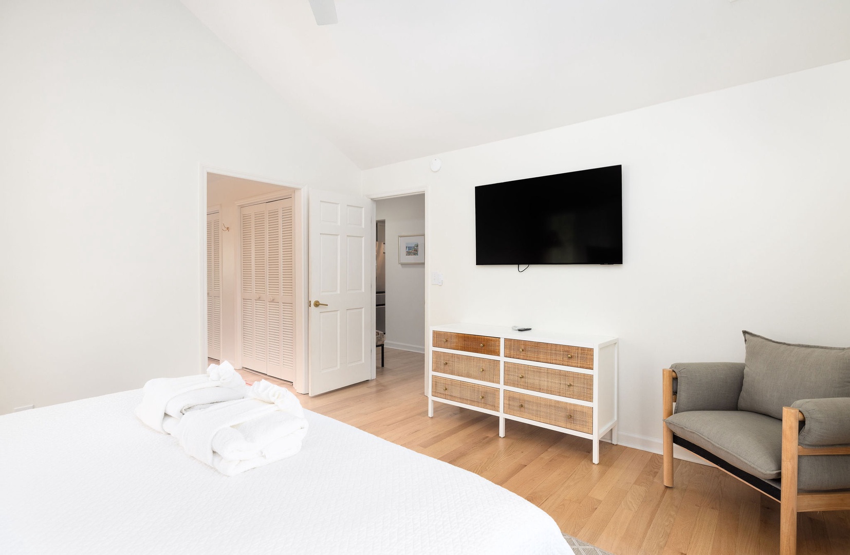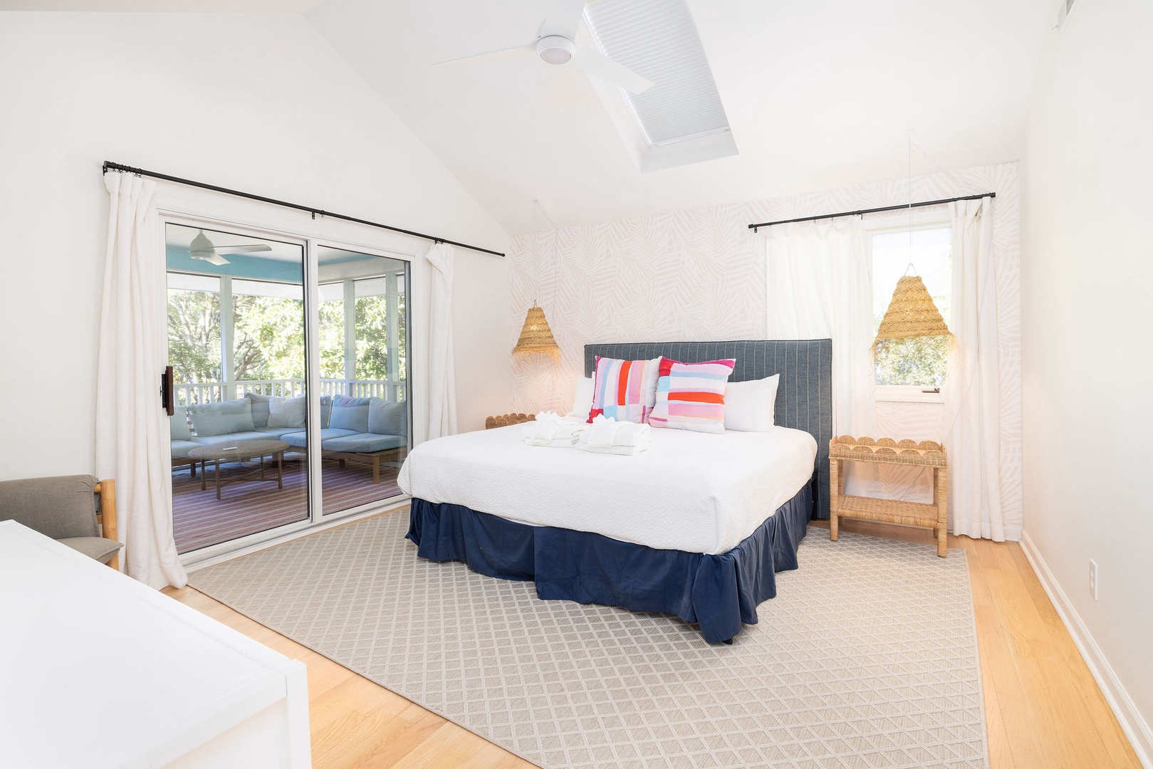 Master Bedroom: King bed, en-suite bathroom with large bathtub, vanity room, and double doors to a private screened-in deck.