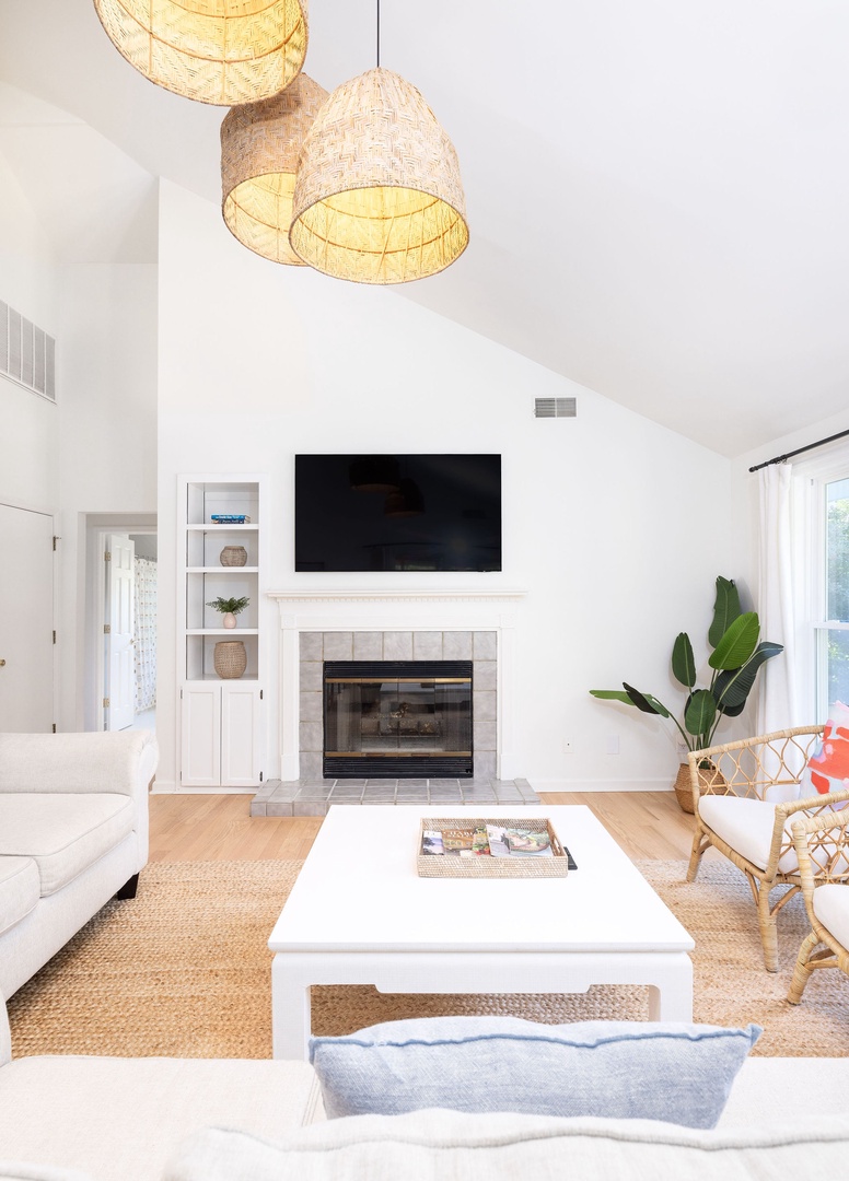 Professionally decorated living room with wood floors, a decorative fireplace, and colorful accents.