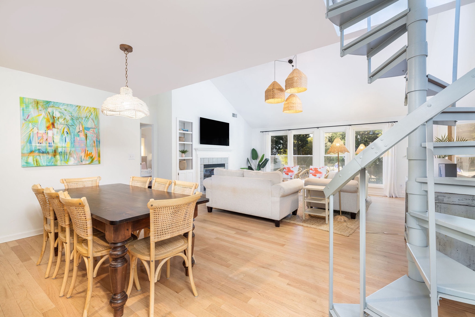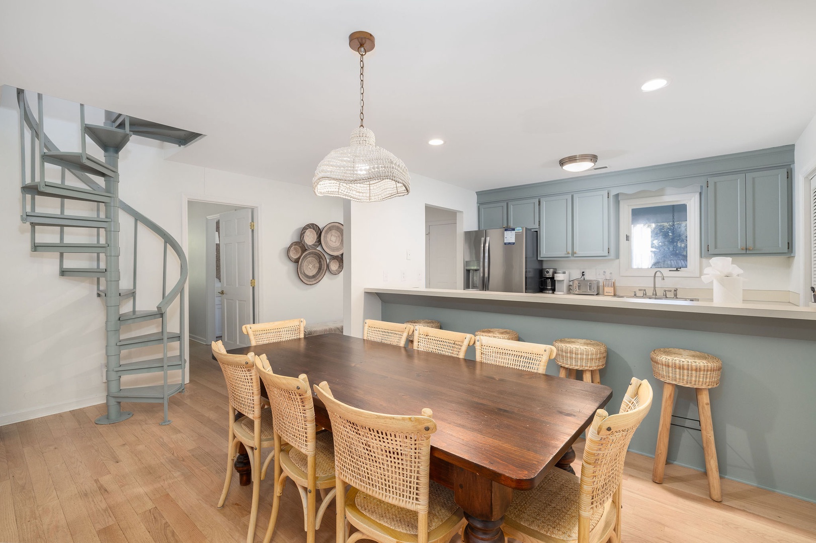 Large dining table and additional seating at the kitchen bar for family meals and gatherings.