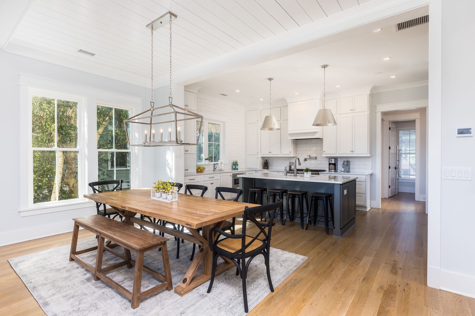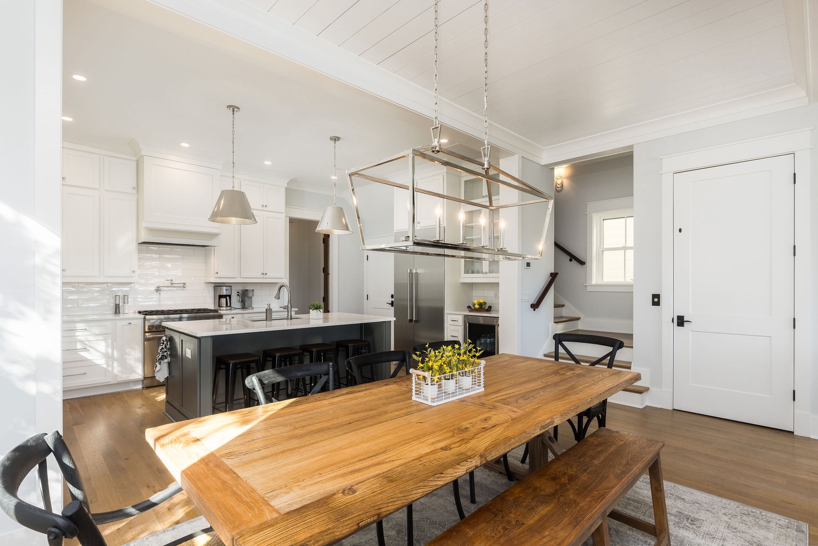 Spacious dining area with a beautiful farm table for family meals or entertaining.