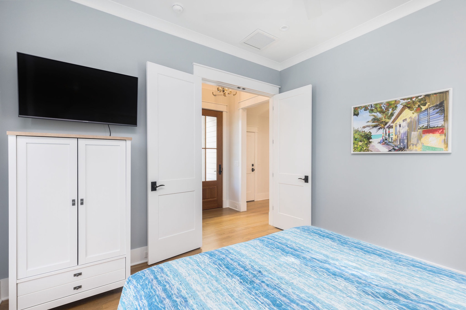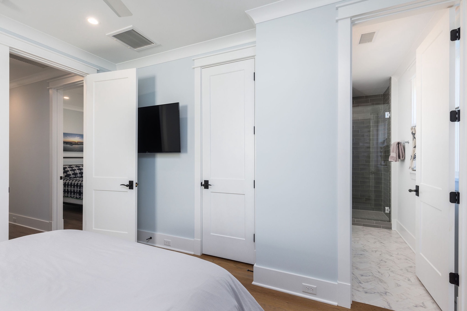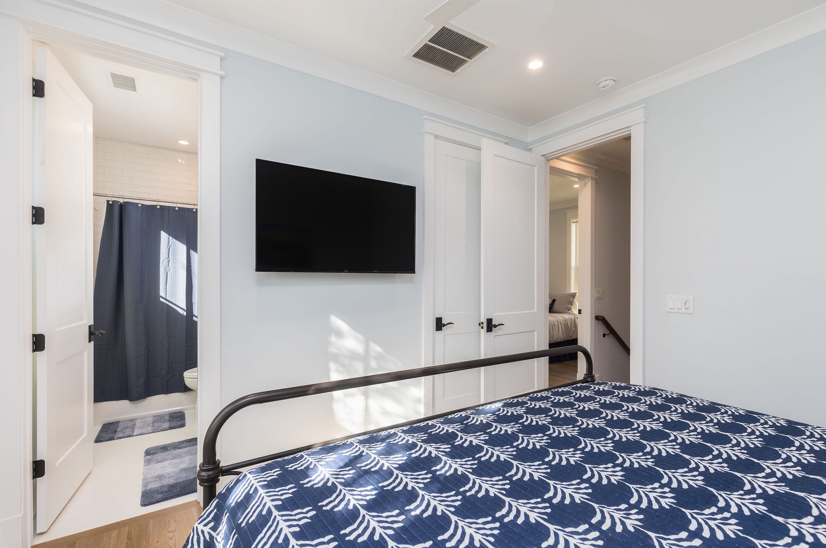 Bedroom 1 (Main Floor): Queen bed, flat-screen TV, and access to a nearby half bathroom.